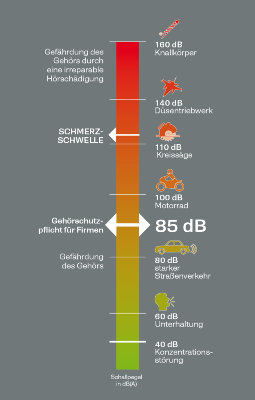 Lärm wird dann äußerst gefährlich, wenn er einen Pegel von über 85 dB (A) über einen ununterbrochnen Zeitraum von 8 Stunden pro Tag erreicht. In diesen Fällen muss unbedingt ein Gehörschutz getragen werden!