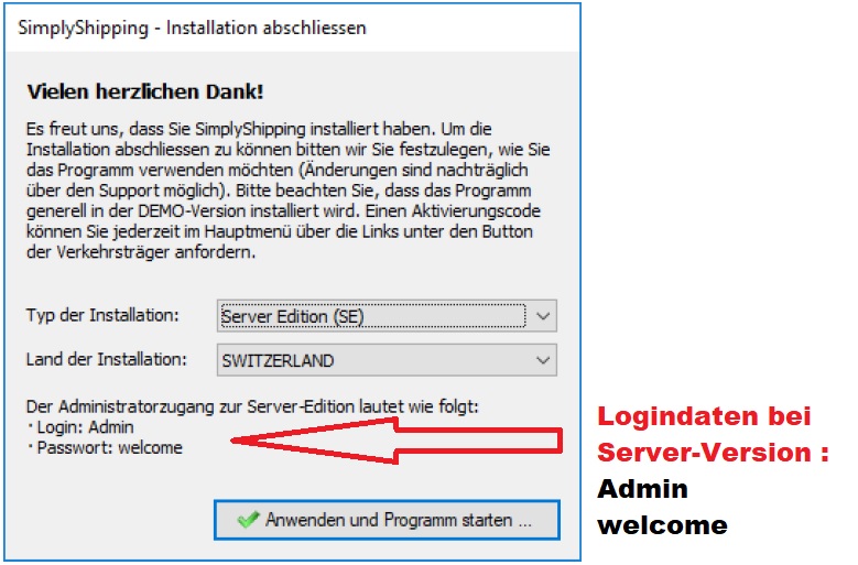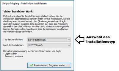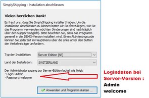 Zugangsdaten beim Installationstyp "Server-Version SE"