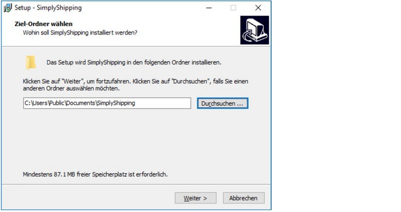 Wählen Sie im ersten Schritt den Ziel-Ordner für die Installation von SimplyShipping. Beachten Sie dabei, dass Sie einen Ordner mit Lese- und Schreibzugriff auswählen (zum Beispiel «öffentliche Dokumente»).